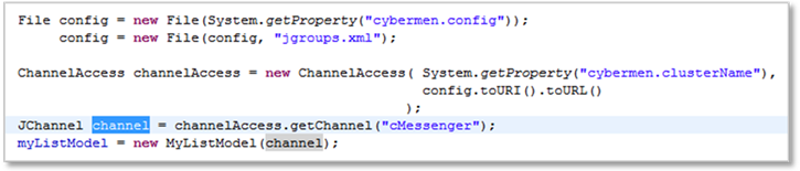 Aquellos desarrollos que empleen JGroups, ya sea de manera directa como mecanismo de mensajería asincrónica, o por medio de herramientas de terceros, deberán gestionar el JChannel de JGroups por medio de la clase ChannelAccess del paquete " org.cyberLinker.client" y el método getChannel(String channelName). Ver el ejemplo siguiente